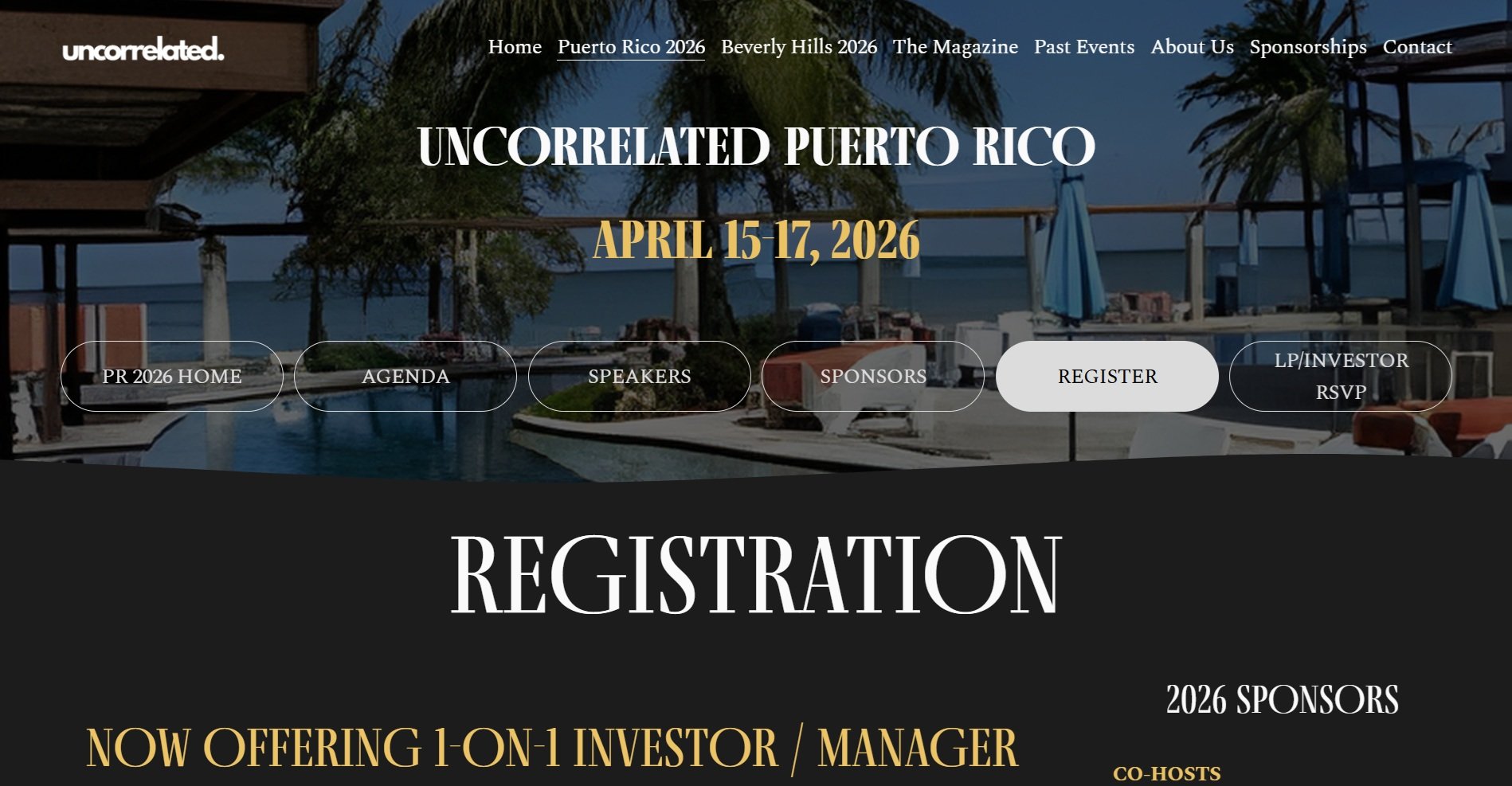 The Uncorrelated Puerto Rico conference takes place April 15-17, 2026, at Vivo Beach Club in San Juan. The event brings together 400+ institutional investors, family offices, and high-net-worth individuals to explore alternative investment strategies. The event features dedicated panels on Caribbean real estate opportunities, Act 60 tax incentives, and luxury residential developments across Puerto Rico's most exclusive markets.