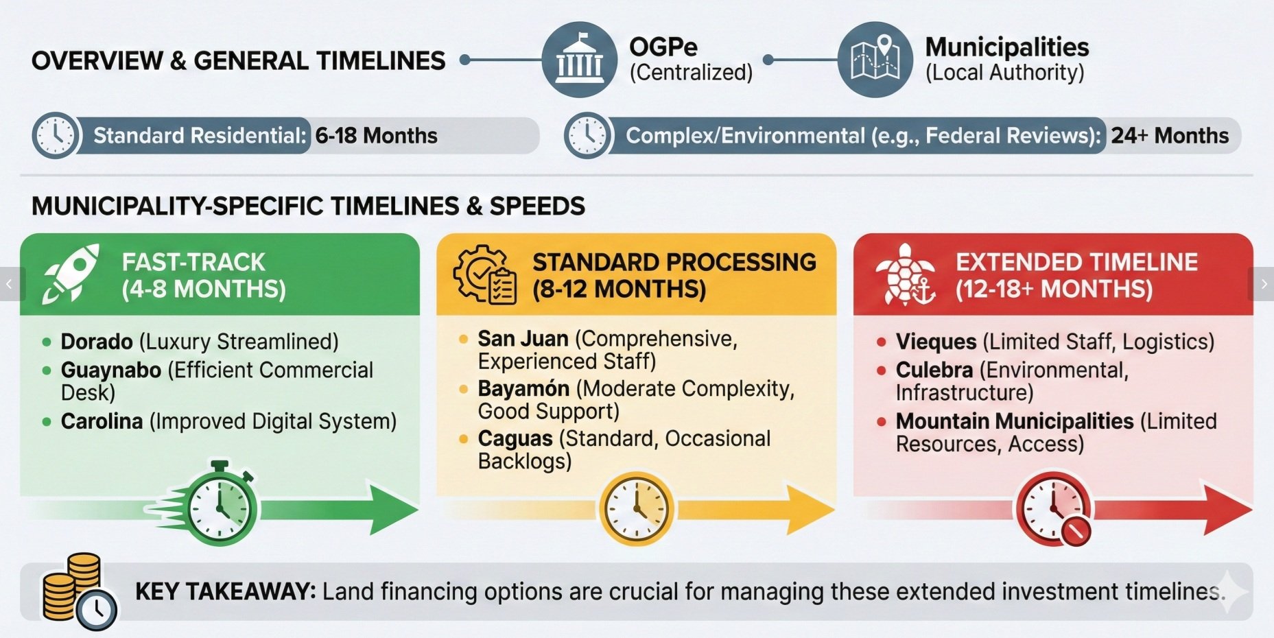 Permitting represents the most complex aspect of land development in Puerto Rico, with timelines varying significantly by municipality and project scope. The Oficina de Gerencia de Permisos (OGPe) centralizes most permitting, but local municipalities retain authority over specific zoning and construction requirements.