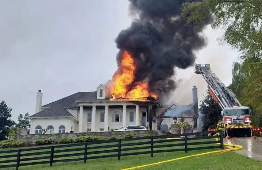 A fire damages the roof of a rental property; coverage helps pay for repairs. |