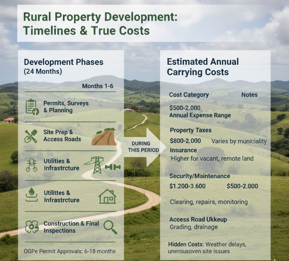 Understanding realistic timelines and carrying costs helps buyers plan rural property development effectively.