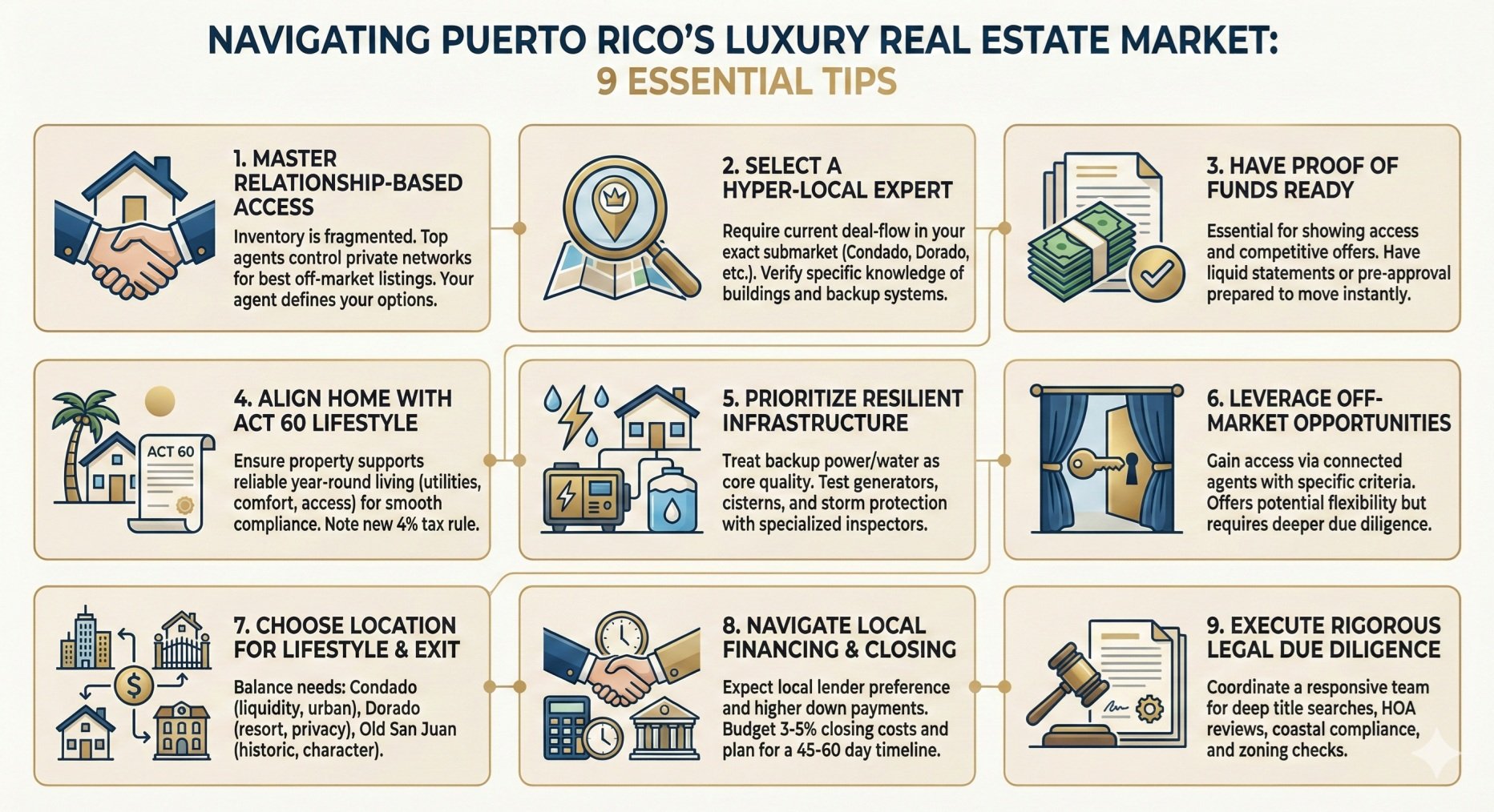 Buying a luxury home in Puerto Rico is not only about taste—it’s about process. The market rewards buyers who arrive prepared: with the right agent access, proof of funds, infrastructure awareness, and a diligence team that understands Puerto Rico realities. These nine tips are designed to protect you from the most common surprise points mainland luxury buyers face.
